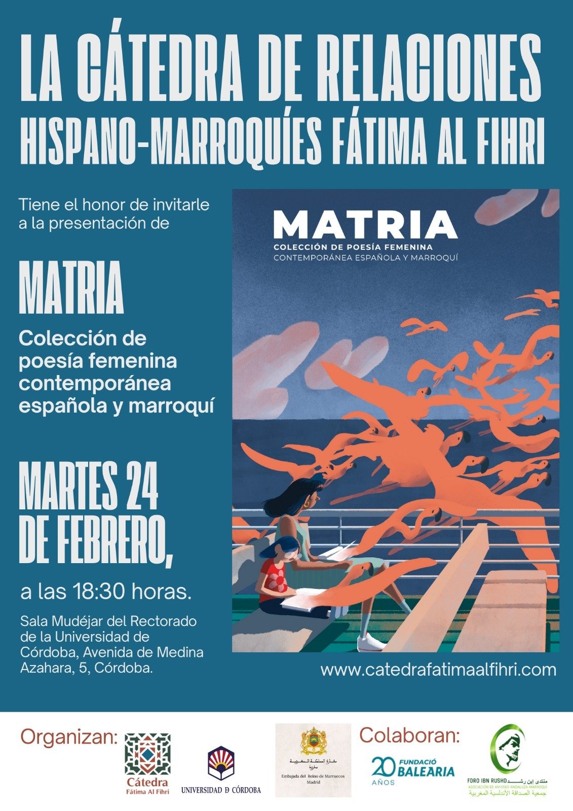 تحتضن جامعة قرطبة، يوم 24 فبراير الجاري، حفل تقديم أنطولوجيا بعنوان «ماتريا: مجموعة الشعر النسائي المعاصر الإسباني والمغربي»، وهي مبادرة أطلقتها مؤسسة «باليريا» وجمعية الصداقة الأندلسية المغربية «منتدى ابن رشد.»