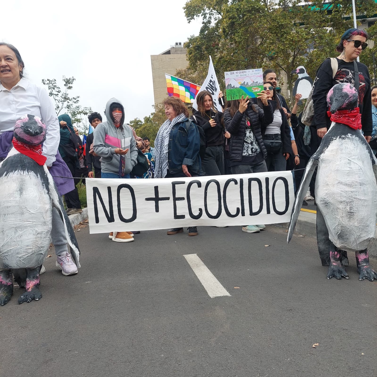 وحول هذه الفصيلة المستوطنة في السواحل التشيلية (بطاريق هومبولت)، امتلأت الشوارع بالشعارات والرموز. حيث قام الفنان البصري والناشط البيئي “مارسيل سولا” (Marcel Solá) —وهو أيضاً مؤسس “متحف الانتفاضة الاجتماعية” في تشيلي— بصنع مجسمين لبطريقين يحملان لافتة. يذكر أن هذا الفنان هو نفسه من صمم نصب الكلب “ماطاباكوس” (Matapacos) الذي أصبح أيقونة للثورة الاجتماعية في أكتوبر 2019. كلا المنحوتتين استلهمتا رمزية الكلب الزنجي من خلال ارتداء “مناديل حمراء” وسط الحشود. تم بناء العملين بالكامل من مواد مهملة ونفايات كانت يوماً رمزاً للاستهلاك، لتعود اليوم كأداة للإدانة والذاكرة وفعل من أفعال المقاومة.
